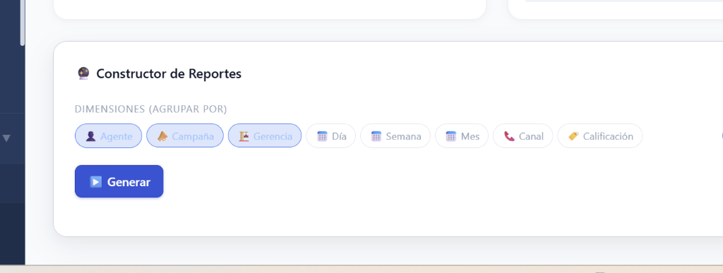 Este constructor corporativo te permite crear consultas de bases de datos de forma visual. Seleccionas las dimensiones (Agente, Campaña, Gerencia) y la plataforma generará automáticamente la visualización correcta sin requerir un analista de datos SQL. Una vez generado, puedes guardarlo como "Favorito".