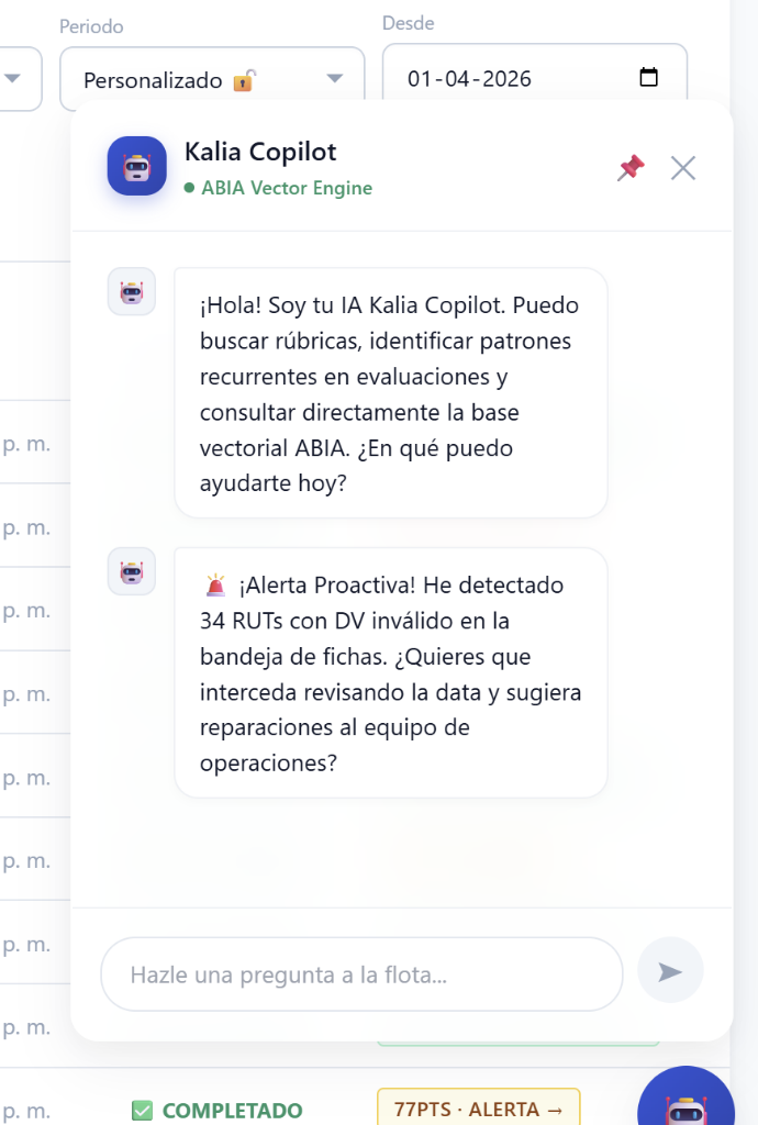Kalia Copilot vive en el ícono del robot flotante de tu pantalla. Constantemente analiza la bandeja de evaluaciones en el fondo buscando anomalías (ej. "El 40% de los agentes están fallando en el saludo inicial hoy").