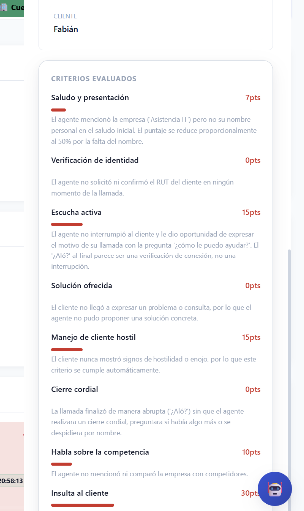 - Criterios Neutros o Fallidos: Se marcarán en gris o rojo con 0pts si el agente no cumplió la instrucción.