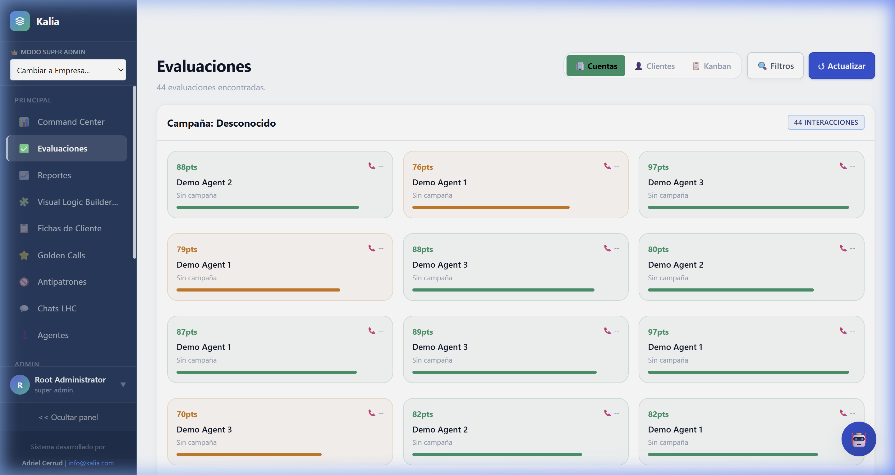 ¿Qué hace KALIA por ti? Tradicionalmente, los equipos de calidad (QA) solo logran escuchar y evaluar entre el 1% y el 3% de las llamadas de los clientes debido a la falta de tiempo y personal. KALIA resuelve esto escuchando, leyendo y analizando el 100% de las interacciones automáticamente utilizando Inteligencia Artificial.