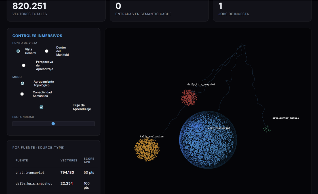 Cada conversación humana (audio o texto) es transformada automáticamente en "Vectores" (coordenadas numéricas multidimensionales). El motor procesa cientos de miles de vectores hiper-optimizados, tal como se aprecia en el panel de control.