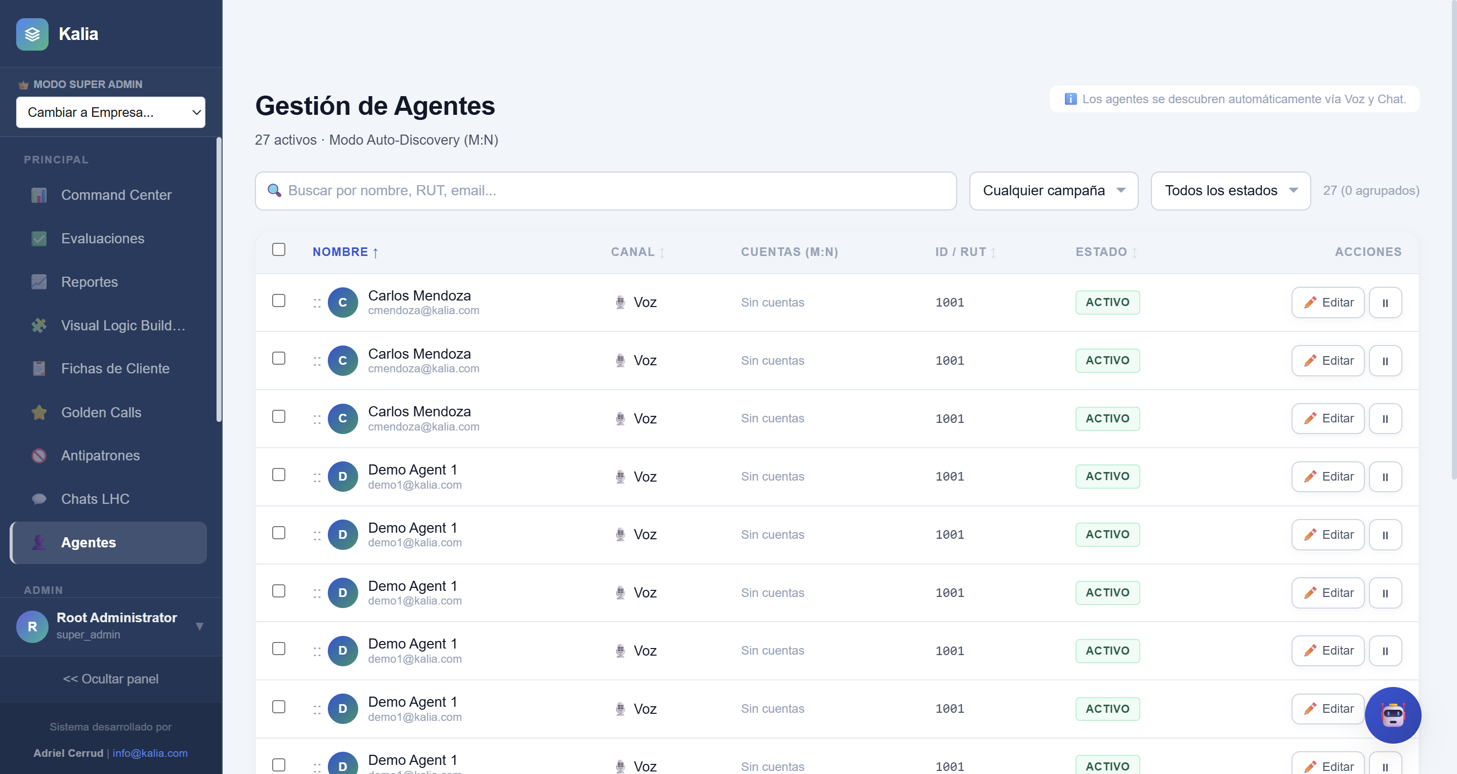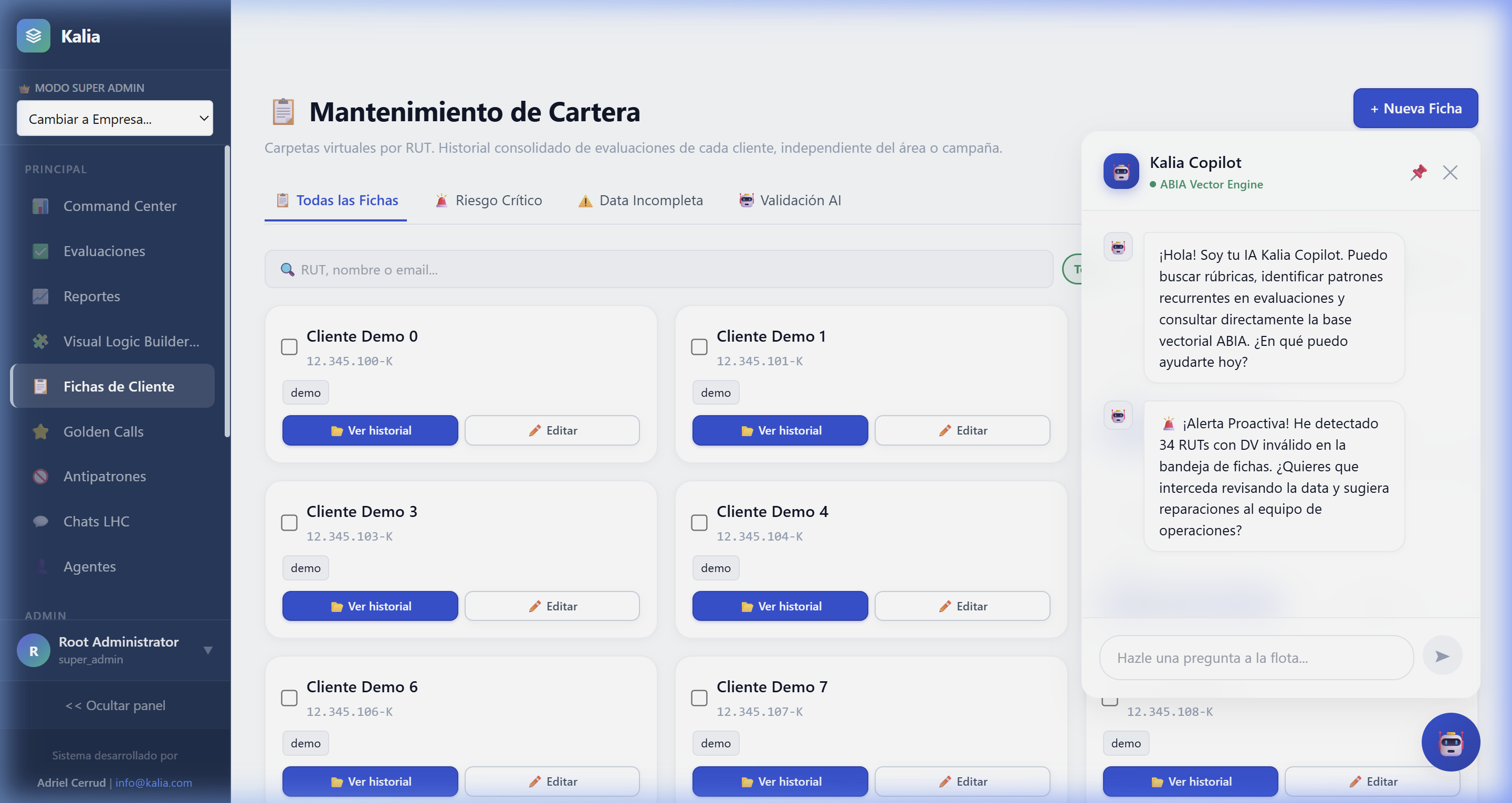 - Validación Biométrica (Módulo 11): Si estás en un entorno financiero o médico, los RUTs son clave. Si KALIA detecta que un agente ingresó un RUT falso o digitado erróneamente, te lanzará una alerta roja. Con un solo clic en "Auto-reparar Todos", la IA intentará corregir el dígito verificador matemáticamente para limpiar tu base de datos.