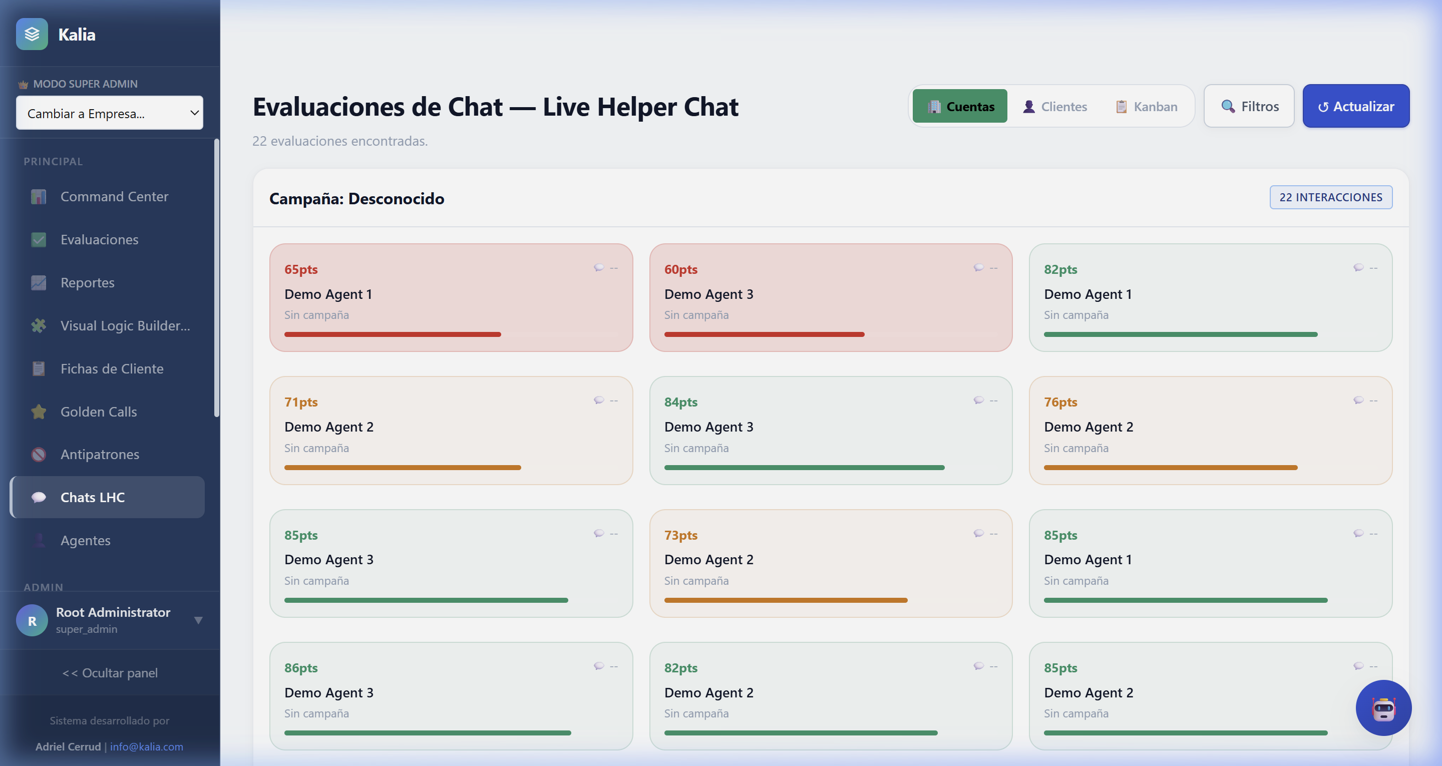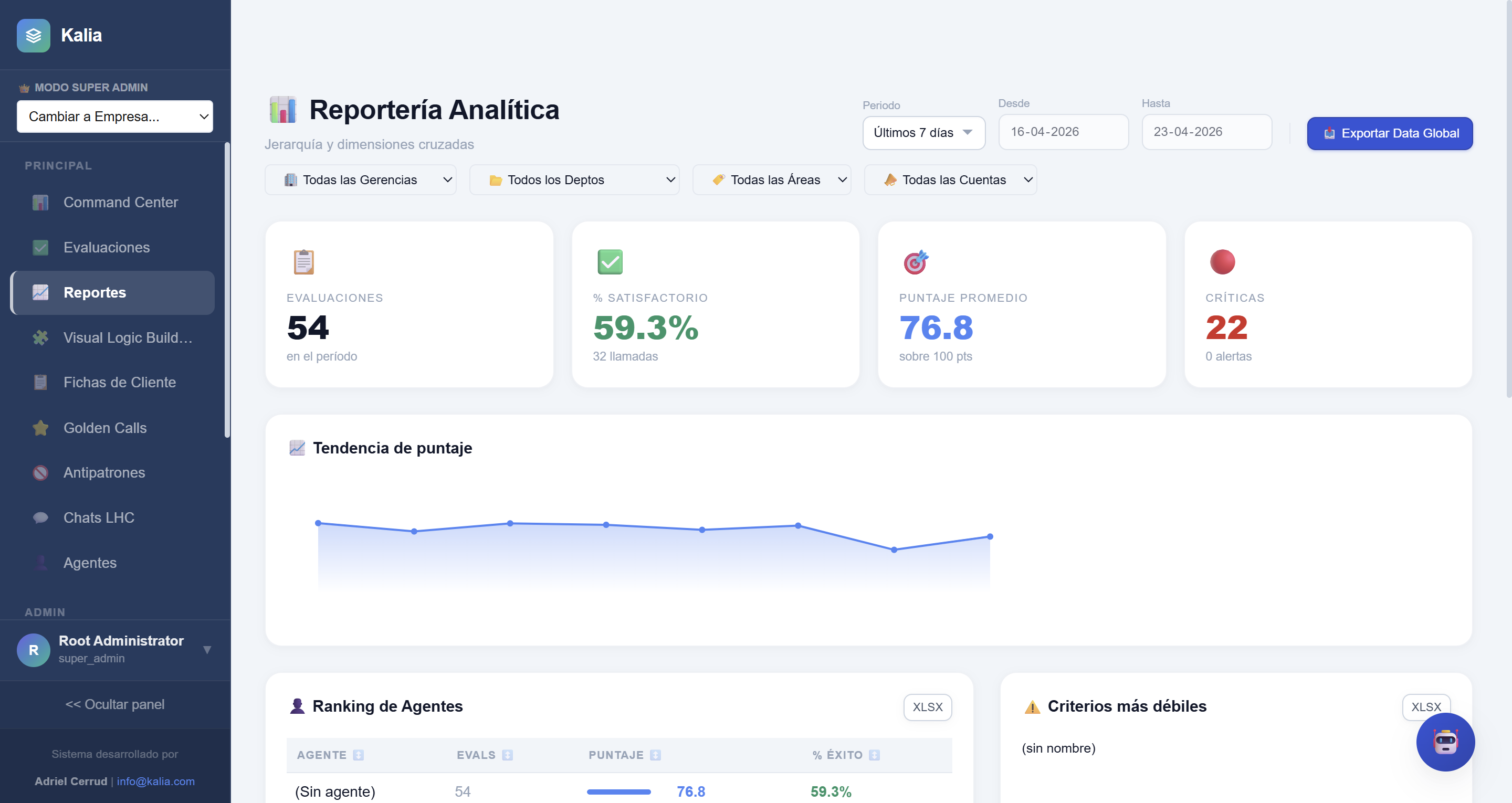 - Métricas de Volumen: Observa el total de interacciones analizadas en el mes o el promedio general de calidad (Ej: 85/100).