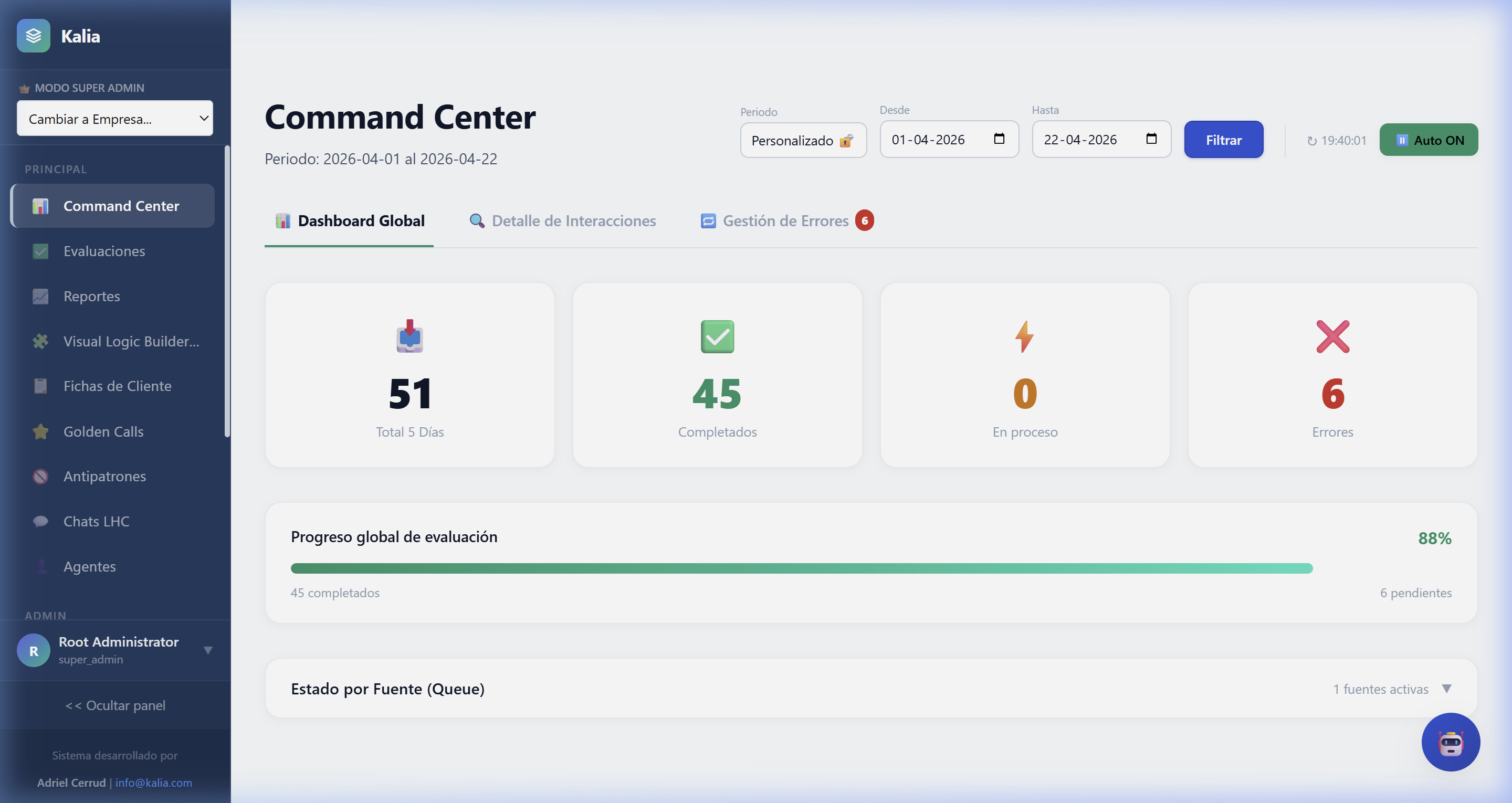 - Carga de Servidores: Si ves un indicador de "Llamadas en cola", significa que KALIA está procesando audios recientes que acaban de entrar. Espera unos minutos y estarán listos.