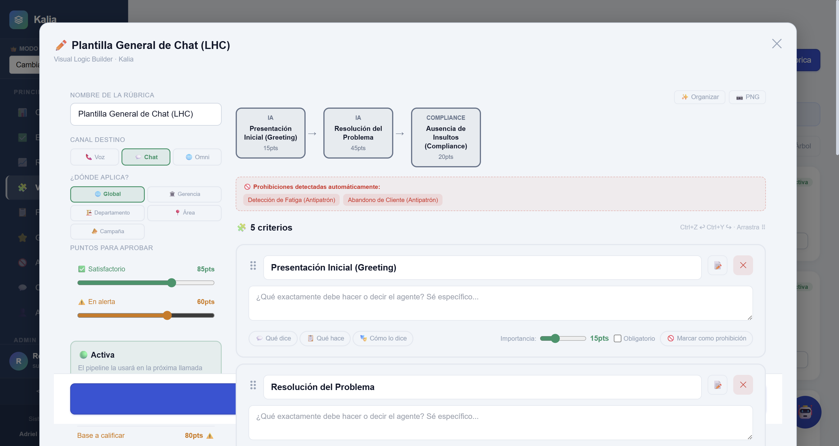 - Penalidades (Antipatrones): Criterios que restan puntaje directamente si el agente incurre en faltas graves (Ej: "Insulta al cliente: -30pts").