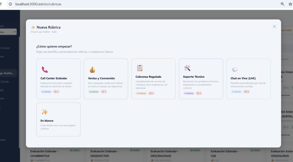 Para facilitar la implementación en nivel Enterprise, KALIA te ofrece una galería de plantillas especializadas. Al crear una nueva rúbrica, no tienes que empezar desde cero. Puedes elegir plantillas como "Call Center Estándar", "Ventas y Conversión", o "Cobranza Regulada". Estas plantillas vienen con reglas pre-construidas por expertos en QA para asegurar el cumplimiento (compliance) desde el primer día.